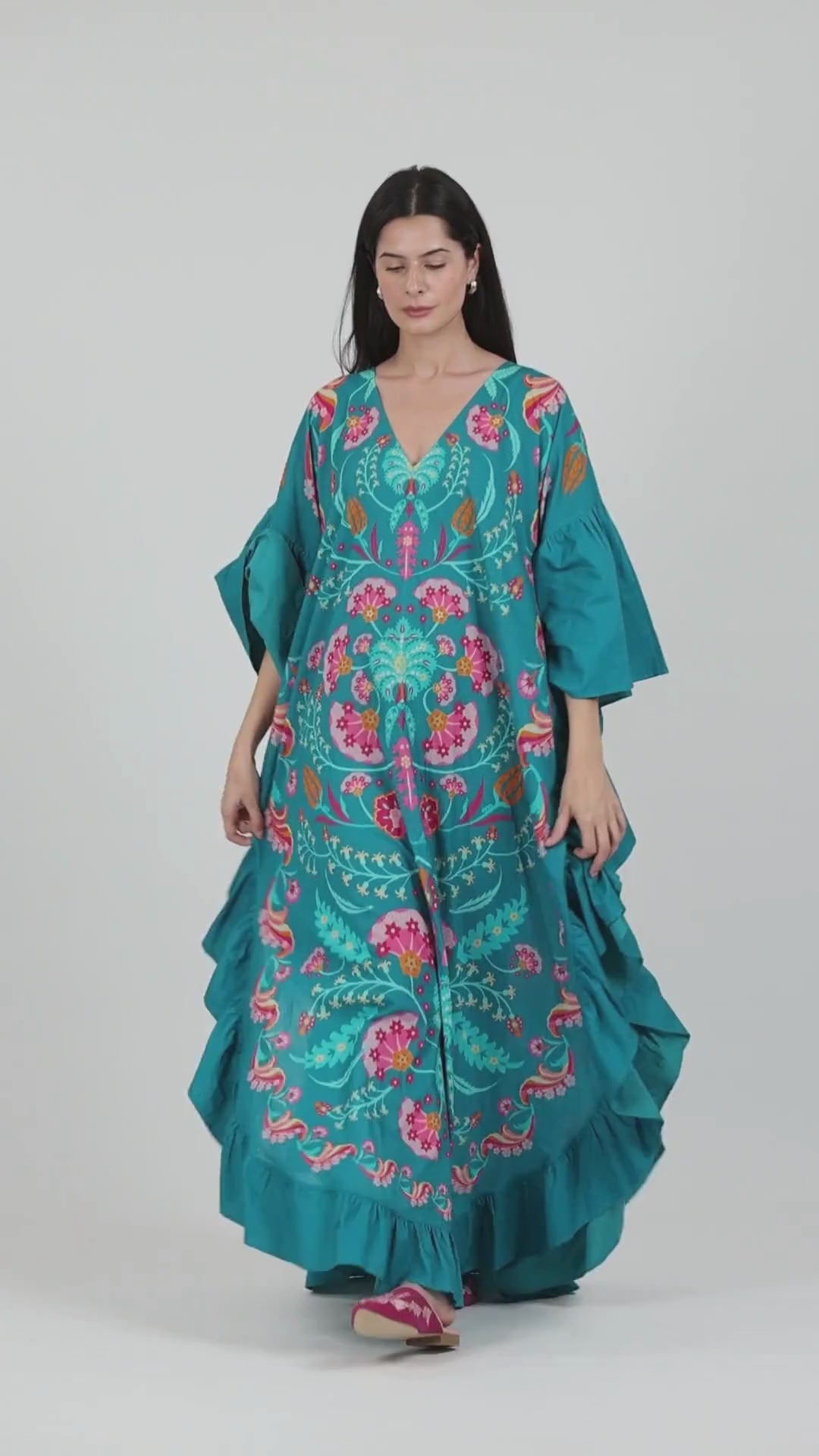 Adorned with our in-house Iznik Floral Motif, this dress boasts a relaxed silhouette flaring subtly at the hem for a gentle petal-like effect. Its deep V-neckline, double side slits, and wide cascading ruffle sleeves provide effortless playful allure, perfect for summer al fresco soirées or impromptu escapes to tropical shores. Discreet side pockets. Slip-on, no closures.
